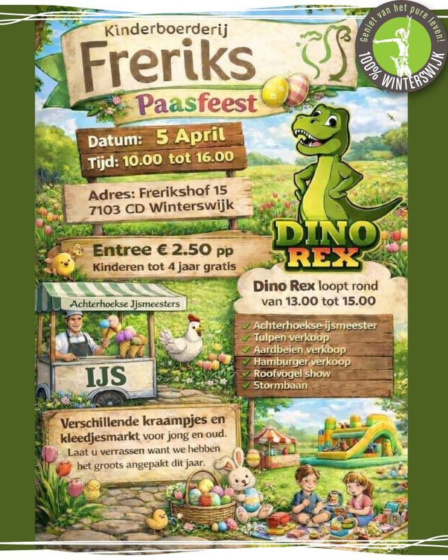 Geniet van het Paasfeest bij kinderboerderij Freriks met o.a. een kleedjesmarkt, kraampjes, een stormbaan en een roofvogelshow op Eerste Paasdag (5 april).
