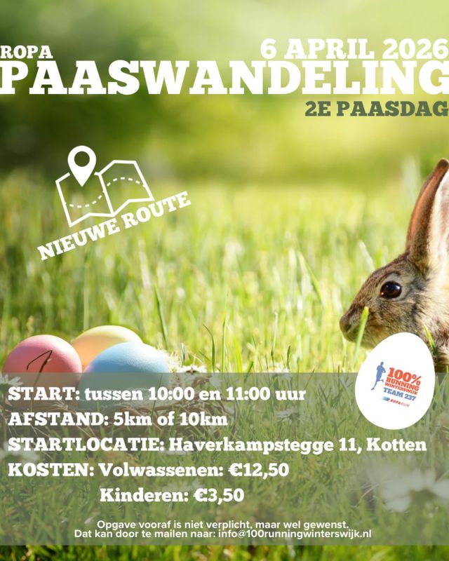 Wandel mee met de Roparun paaswandeling van 100% Running Winterswijk op Tweede Paasdag (6 april).